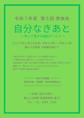 家族会延期のお知らせ 12月28日(土)第6回に家族会を予定しておりましたが、昨今のコロナ感染者増加の状況を考慮し、延期させて頂きます。 次回再開日程は未定ですが、再開が可能となりましたらお知らせ致します。 皆様の御理解、ご協力をお願い申し上げます。